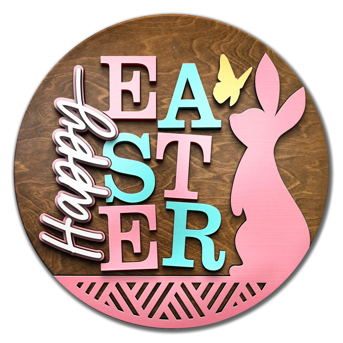 Featuring artistically lettered “Happy Easter” script paired with a classic bunny silhouette, this design blends charm and simplicity for a timeless seasonal look. The flowing lettering adds a soft, handcrafted feel, while the layered wood elements create depth and dimension that make it stand out on any door.