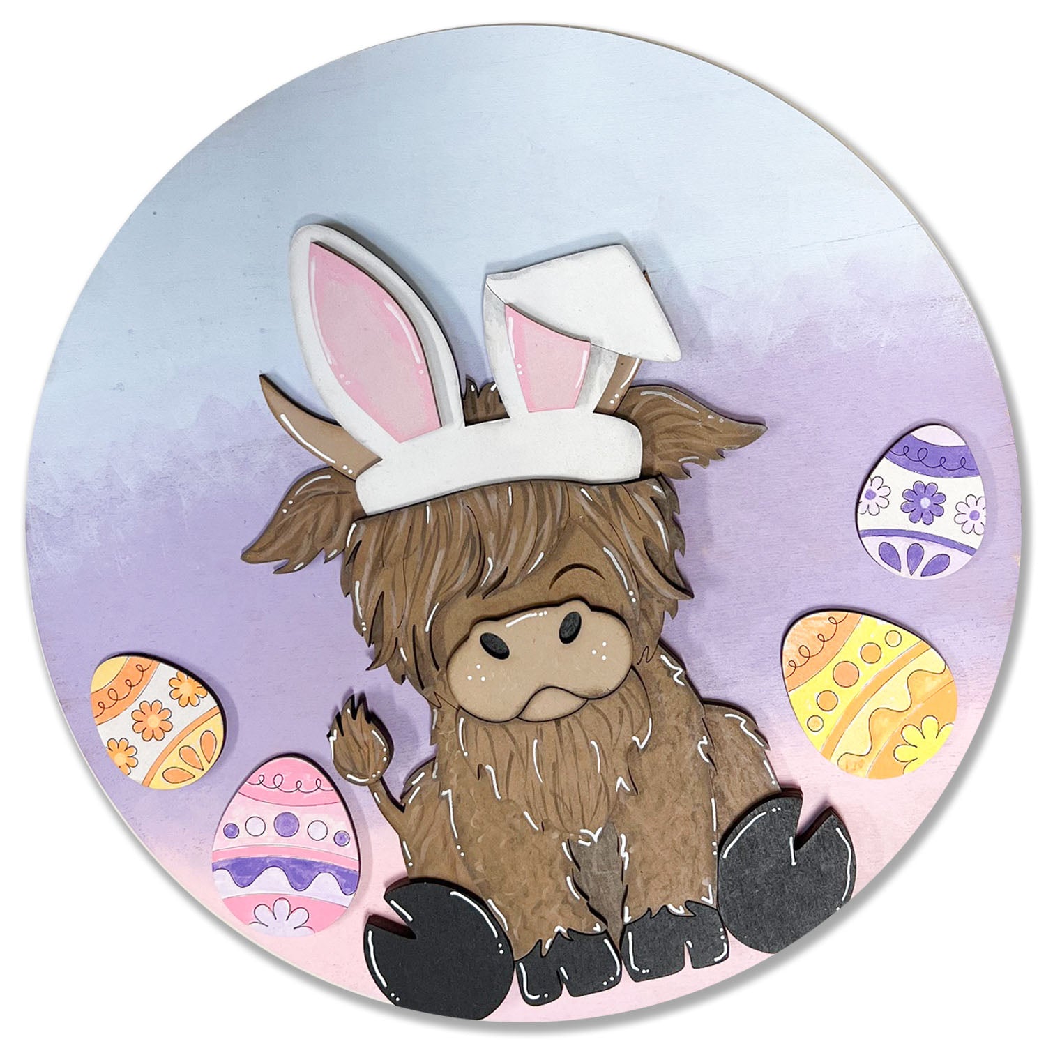 This adorable Easter-themed door hanger features a sweet Highland cow sporting festive bunny ears, with decorated Easter eggs for the perfect seasonal touch. The layered wood design brings beautiful depth and dimension, making every detail — from the fluffy hair to the patterned eggs — truly stand out.